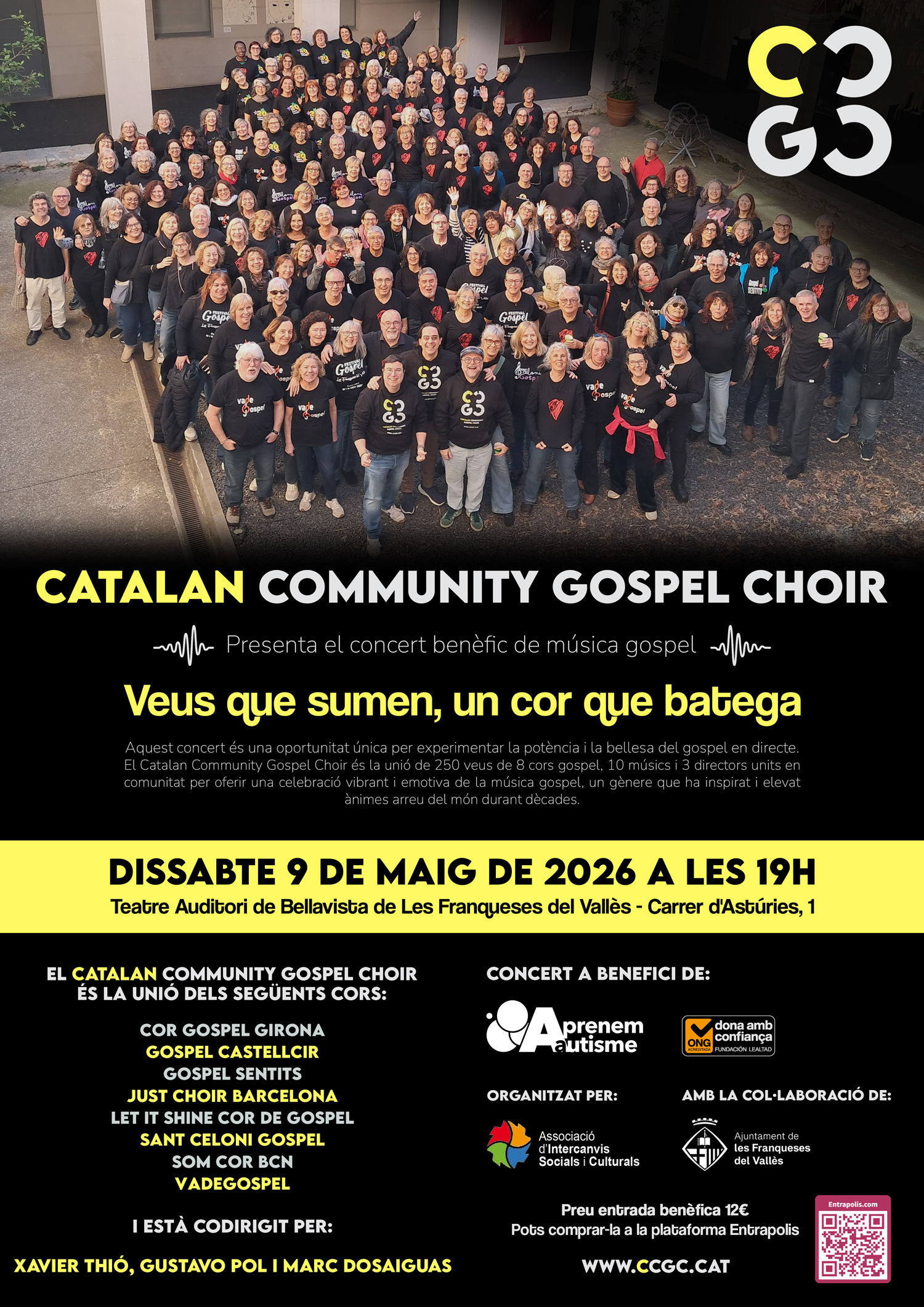 El CCGC és un projecte artístic i humà de gran format que neix de la unió de 250 veus provinents de 8 cors d’arreu del territori. Aquesta impressionant massa coral pren una dimensió única dalt de l’escenari gràcies a l’acompanyament en directe de 10 músics excepcionals i la visió compartida dels seus tres directors, creant un espectacle vibrant on la música gospel esdevé una autèntica celebració de l’energia, la comunitat i l’emoció.